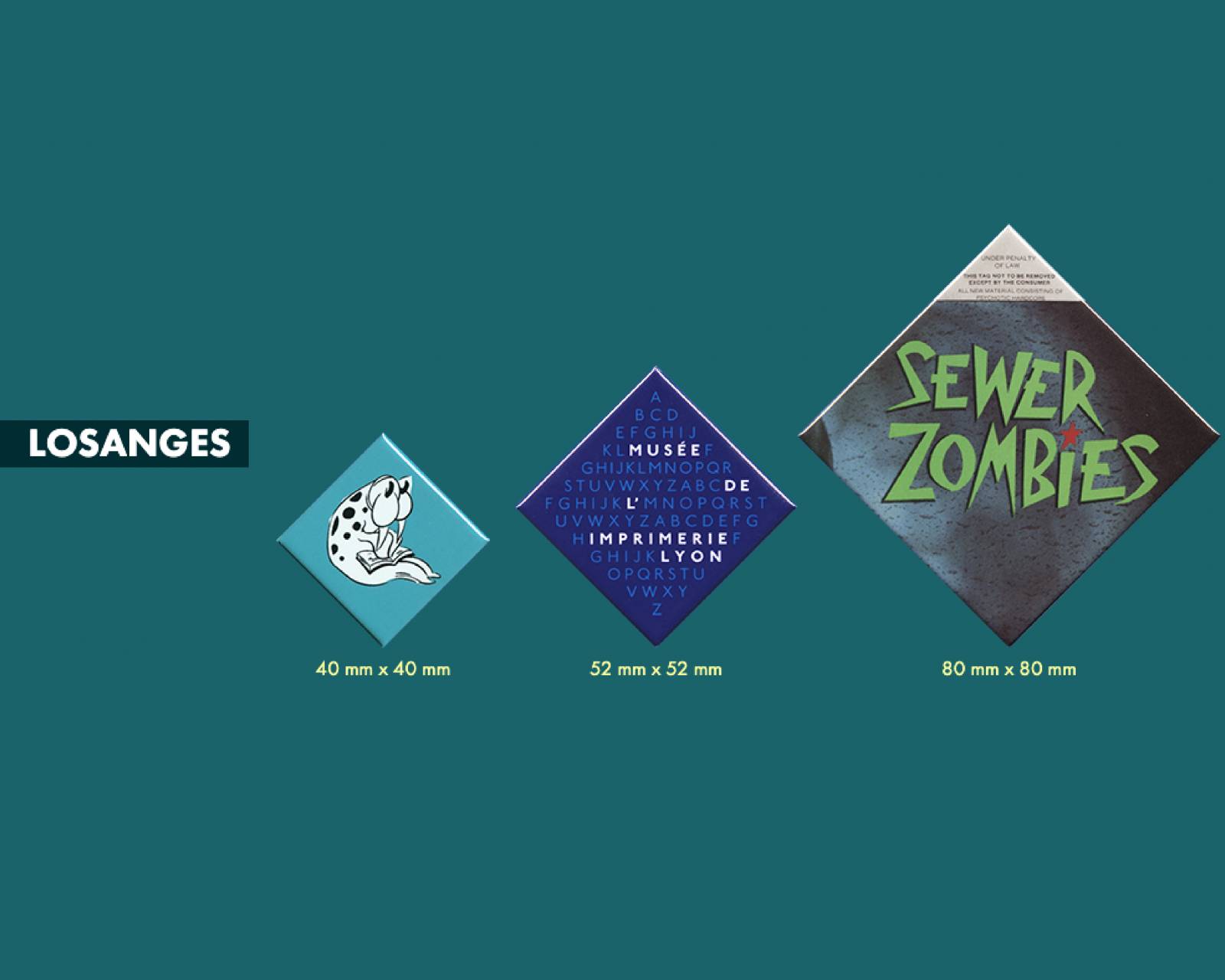 - Badge en forme de losange personnalisés: 40x40, 52x52, 80x80mm