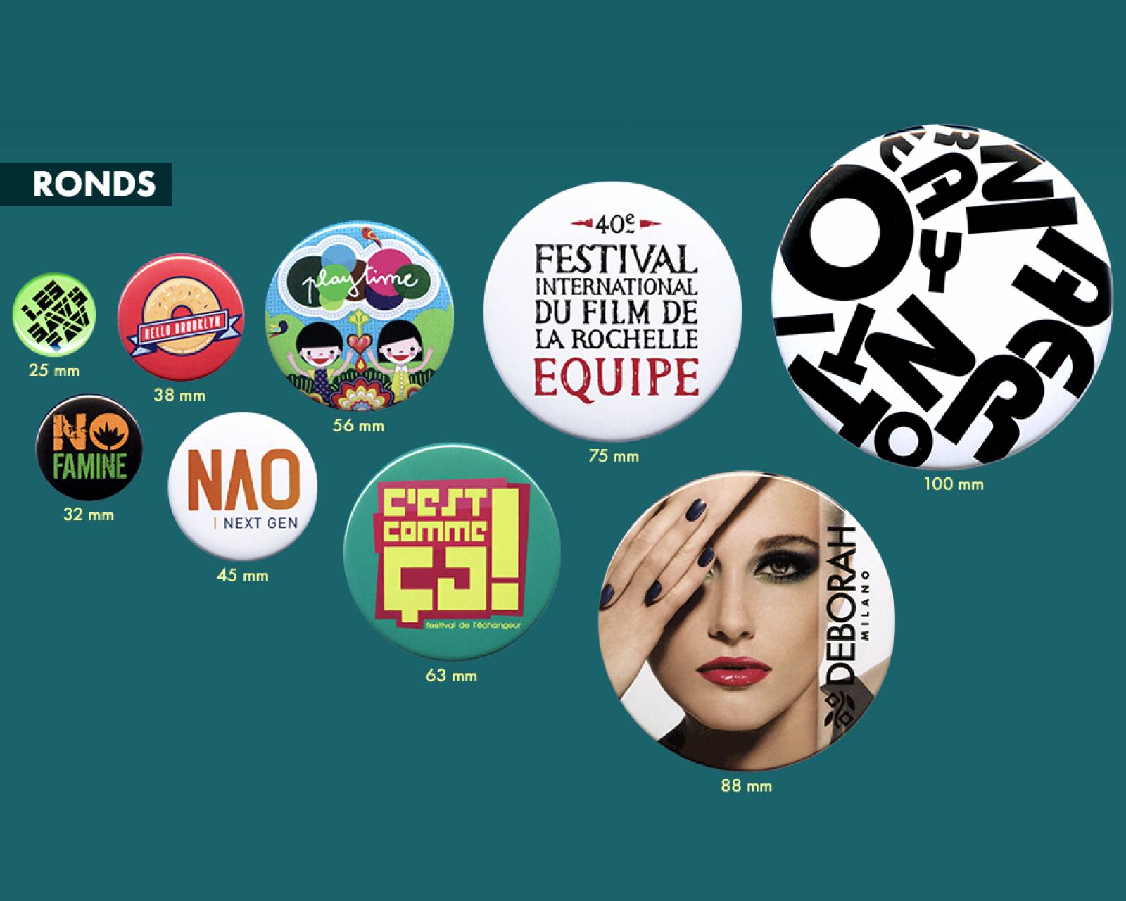 - Badge rond personnalisé: 25Ø, 32Ø, 38Ø, 45Ø, 56Ø, 63Ø, 75Ø, 88Ø et 100Ø mm