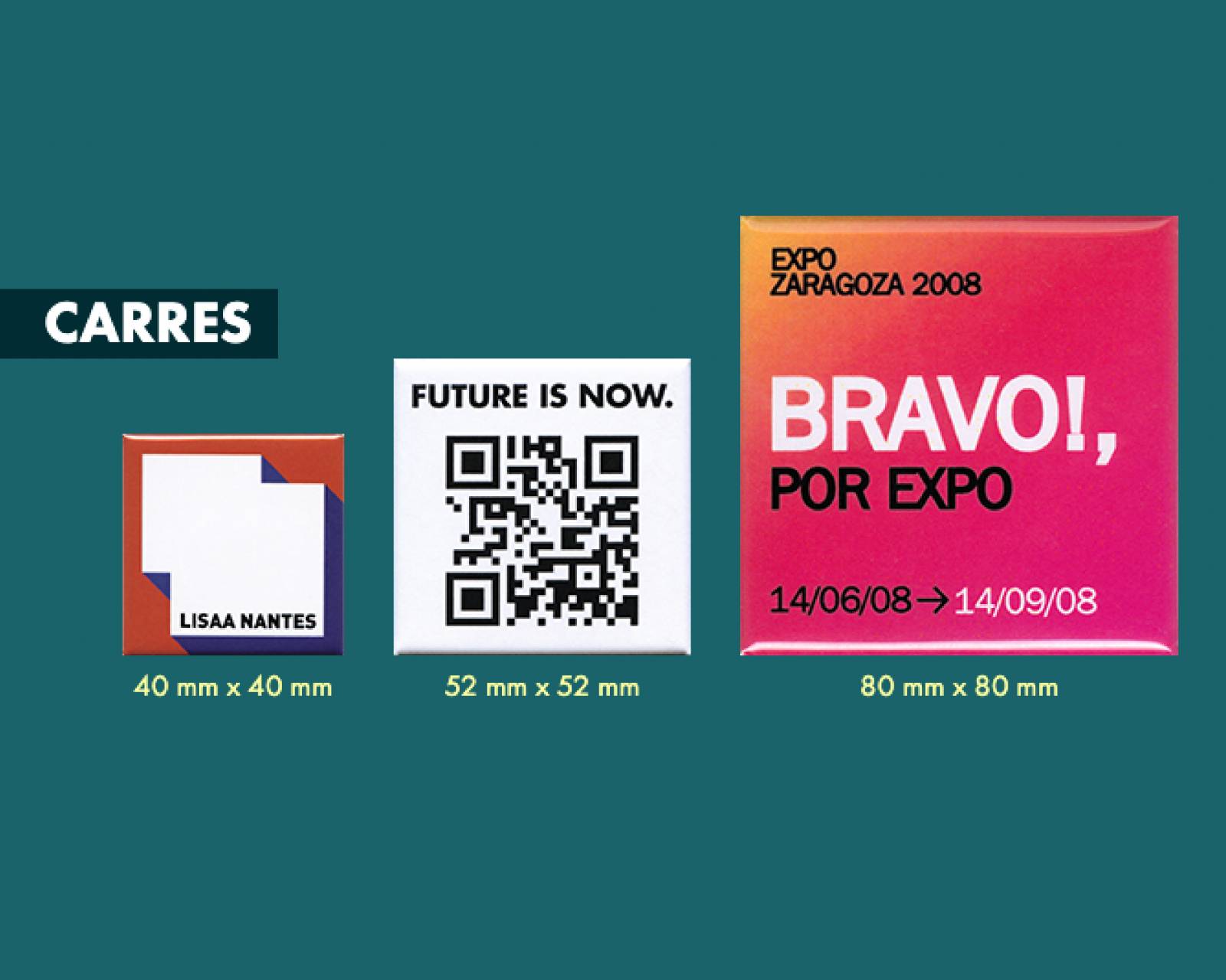 - Badge carré personnalisé: 25x25, 40x40, 52x52, 65x65, 80x80mm