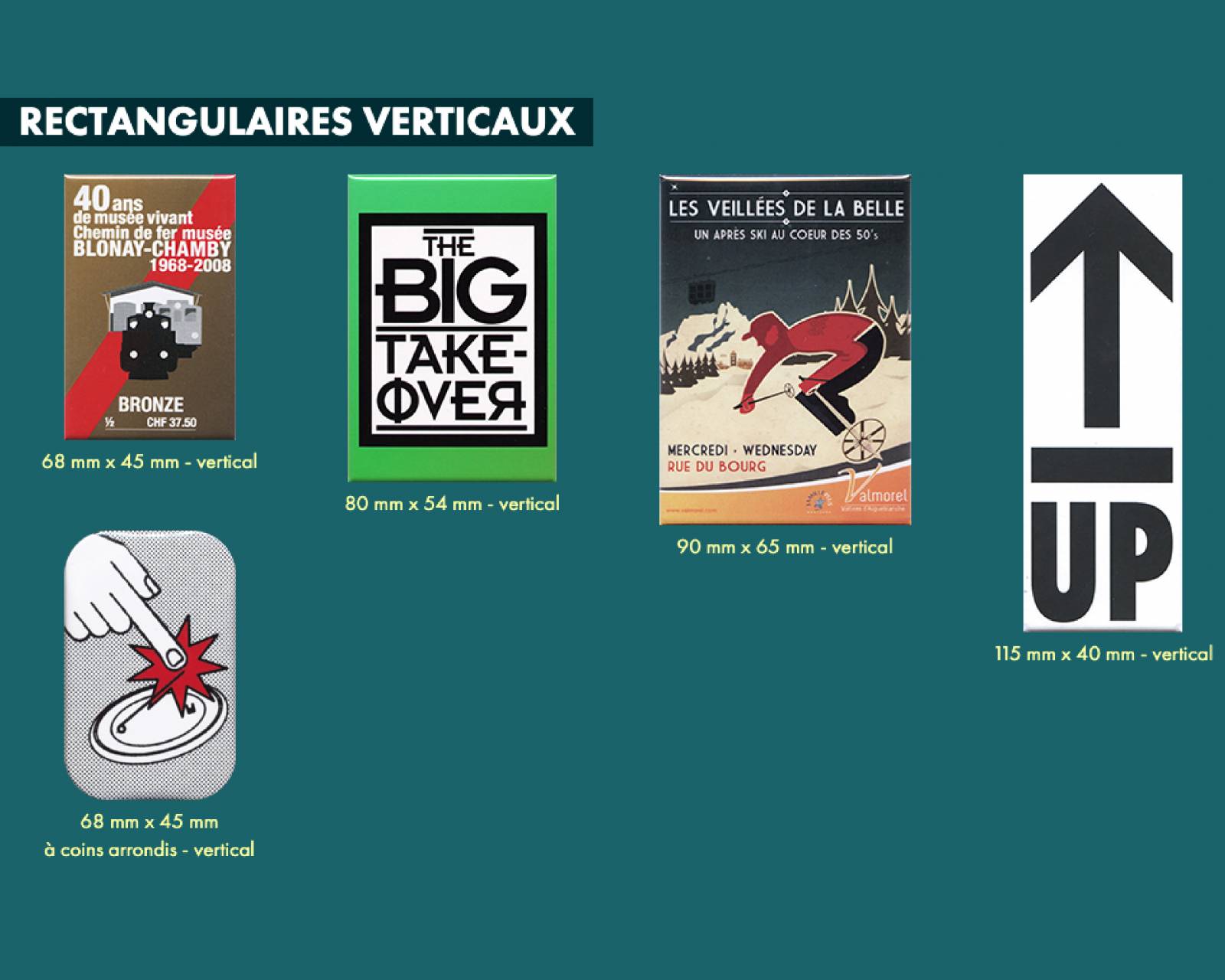 - Badge rectangulaire personnalisé: 68x45, 80x54, 90x65, 115x40mm (à la verticale ou à l'horizontale)
