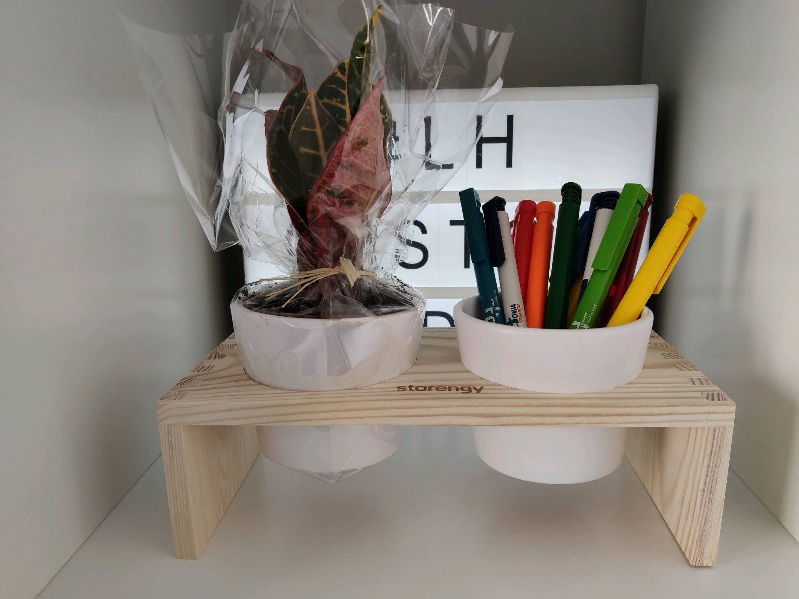 Sur le modèle présenté en photo, vous trouverez un double pot en céramique blanche posé sur un plateau en bois gravé du logo du client.